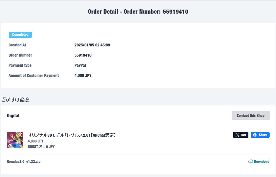 In the booth websites, click your name > purchases and then click into the regulus, it will show all of the order details there. Can screenshot that as proof and contact me with it.